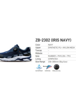 Giày bảo hộ Ziben ZB-2302 (Iris Navy) là một trong các mã sản phẩm cao cấp của hãng giày Ziben, được sử dụng khá phổ biến, ngoài những chất liệu và tính năng thông thường của một đôi giày hãng Ziben như đế cao su kết hợp với các chất liệu sympatex, phần trên giày là kết hợp giữa da cao cấp và lưới, kiểu dáng thời trang. Ngoài ra, phần trên giày là kết hợp giữa da cao cấp và lưới, kiểu dáng thời trang, hệ thống khóa xoay rất tiện lợi. Ngoài ra, giày Ziben 2302 (Iris Navy) có cấu tạo và đặc điểm nổi bật là chức năng thông hơi thoáng khí (ventilation)