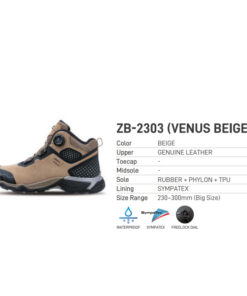 Giày bảo hộ Ziben ZB-2303 (Venus Beige) là một trong các mã sản phẩm cao cấp của hãng giày Ziben, được sử dụng khá phổ biến, ngoài những chất liệu và tính năng thông thường của một đôi giày hãng Ziben như đế cao su kết hợp với các chất liệu sympatex, phần trên giày là kết hợp giữa da cao cấp và lưới, kiểu dáng thời trang. Ngoài ra, phần trên giày là kết hợp giữa da cao cấp và lưới, kiểu dáng thời trang, hệ thống khóa xoay rất tiện lợi. Ngoài ra, giày Ziben 2303 (Venus Beige) có cấu tạo và đặc điểm nổi bật là chức năng thông hơi thoáng khí (ventilation)