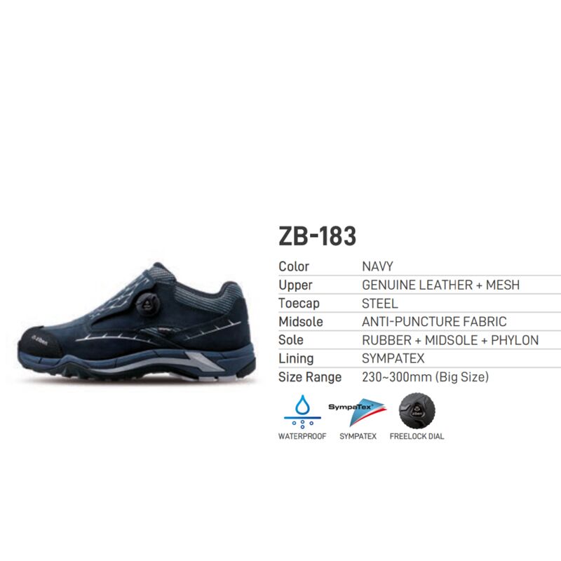 Ziben là một nhà máy sản xuất giày bảo hộ lao động số một tại Hàn Quốc, Giày bảo hộ Ziben ZB 183 là một trong các mã sản phẩm cao cấp của hãng. Lĩnh vực kinh doanh chính của Ziben là sản xuất và phân phối Giày bảo hộ cao cấp, ngoài ra Ziben còn có nhà máy riêng chuyên về đồng phục, các sản phẩm của thương hiệu Ziben được định vị là sản phẩm cao cấp, kiểu dáng thời trang nhưng chức năng bảo hộ vượt trội so với các sản phẩm cùng ngành trên thị trường. Ziben áp dụng công nghệ tiên tiến nhất thế giới, và điểm đặc biệt nhất của giày Ziben chính là công nghệ chống thấm nước SYMPATEX (Đức), chống nước 100% nhưng vẫn đảm bảo thoáng khí. Sympatex là tập đoàn của Đức có chi nhánh tại 25 quốc gia trên thế giới. Ngoài ra, đa số giày Ziben sử dụng hệ thống khóa xoay, rất tiện lợi khi sử dụng giày (mang vào/ cởi ra). Vật liệu làm nên đôi giày Ziben củng rất đặc biệt, ngoài nhưng vật liệu cơ bản trong nước, thì các vật liệu đặc chủng được nhập khẩu từ các nước có nền sản xuất và công nghệ tiên tiến như Đức, Hàn Quốc…