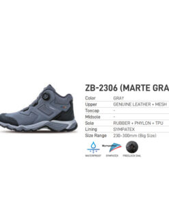 Giày bảo hộ Ziben ZB-2306 (Marte Gray) là một trong các mã sản phẩm cao cấp của hãng giày Ziben, được sử dụng khá phổ biến, ngoài những chất liệu và tính năng thông thường của một đôi giày hãng Ziben như đế cao su kết hợp với các chất liệu sympatex, phần trên giày là kết hợp giữa da cao cấp và lưới, kiểu dáng thời trang. Ngoài ra, phần trên giày là kết hợp giữa da cao cấp và lưới, kiểu dáng thời trang, hệ thống khóa xoay rất tiện lợi. Ngoài ra, giày Ziben 2306 (Marte Gray) có cấu tạo và đặc điểm nổi bật là chức năng thông hơi thoáng khí (ventilation)