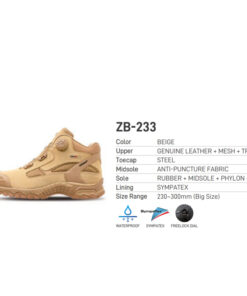 Giày bảo hộ Ziben ZB-233 là một trong các mã sản phẩm cao cấp của hãng giày Ziben, được sử dụng khá phổ biến, ngoài những chất liệu và tính năng thông thường của một đôi giày hãng Ziben như đế cao su kết hợp với các chất liệu sympatex, phần trên giày là kết hợp giữa da thật và lưới, kiểu dáng thời trang. Ngoài ra, phần trên giày là kết hợp giữa da cao cấp và lưới, kiểu dáng thời trang, hệ thống khóa xoay rất tiện lợi. Ngoài ra, giày Ziben 233 có cấu tạo và đặc điểm nổi bật là chức năng thông hơi thoáng khí (ventilation)