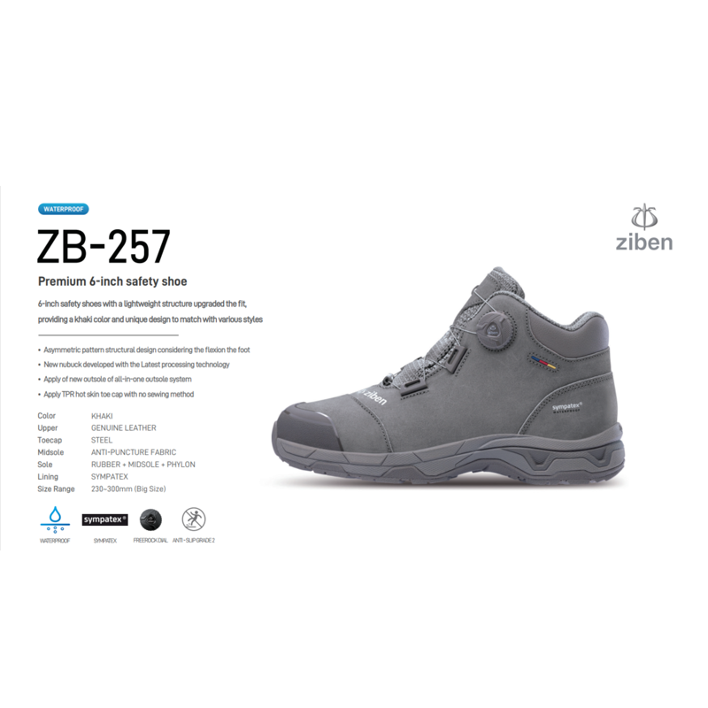 Ziben là một nhà máy sản xuất giày bảo hộ lao động số một tại Hàn Quốc, Giày bảo hộ Ziben ZB 257 là một trong các mã sản phẩm cao cấp của hãng. Lĩnh vực kinh doanh chính của Ziben là sản xuất và phân phối Giày bảo hộ cao cấp, ngoài ra Ziben còn có nhà máy riêng chuyên về đồng phục, các sản phẩm của thương hiệu Ziben được định vị là sản phẩm cao cấp, kiểu dáng thời trang nhưng chức năng bảo hộ vượt trội so với các sản phẩm cùng ngành trên thị trường. Ziben áp dụng công nghệ tiên tiến nhất thế giới, và điểm đặc biệt nhất của giày Ziben chính là công nghệ chống thấm nước SYMPATEX (Đức), chống nước 100% nhưng vẫn đảm bảo thoáng khí. Sympatex là tập đoàn của Đức có chi nhánh tại 25 quốc gia trên thế giới. Ngoài ra, đa số giày Ziben sử dụng hệ thống khóa xoay, rất tiện lợi khi sử dụng giày (mang vào/ cởi ra). Vật liệu làm nên đôi giày Ziben củng rất đặc biệt, ngoài nhưng vật liệu cơ bản trong nước, thì các vật liệu đặc chủng được nhập khẩu từ các nước có nền sản xuất và công nghệ tiên tiến như Đức, Hàn Quốc…
